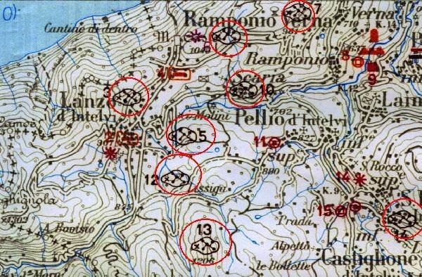 Masso del Pinzernone (o presso la fonte Gnima): di dimensioni imponenti, 4 x 7,8 x 3,5 metri, ospita 90 coppelle e alcune croci.